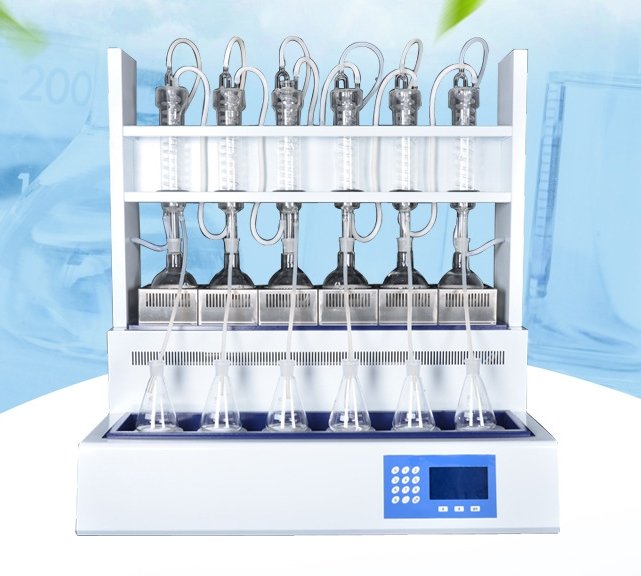在水质化验和食品检测中,蒸馏操作是常见且又重要的前处理步骤。传统的蒸馏设备,其加热、蒸馏、冷凝、接收部分等各自独立,操作繁琐,效率较低,且由于缺乏蒸馏终点控制,常导致蒸馏失败,影响工作效率,而且明火加热极易爆瓶,操作危险。